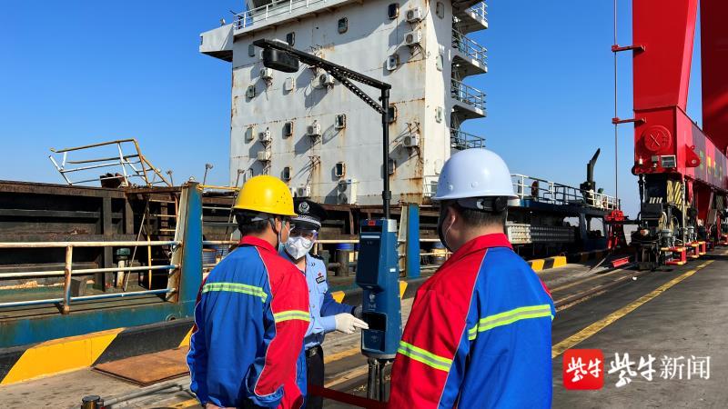 5月5日上午9时,在a片免费看大丰港区通用码头2号泊位,一艘装有5500吨硫磺的伯利兹籍“鸿阳18”轮缓缓进港靠泊,此时在船舶梯口前,大丰海港港口有限责任公司30名码头工人,着白色防护服戴安全帽,正在一台约2.5米高的电子设备前排队,准备核验身份后登轮。