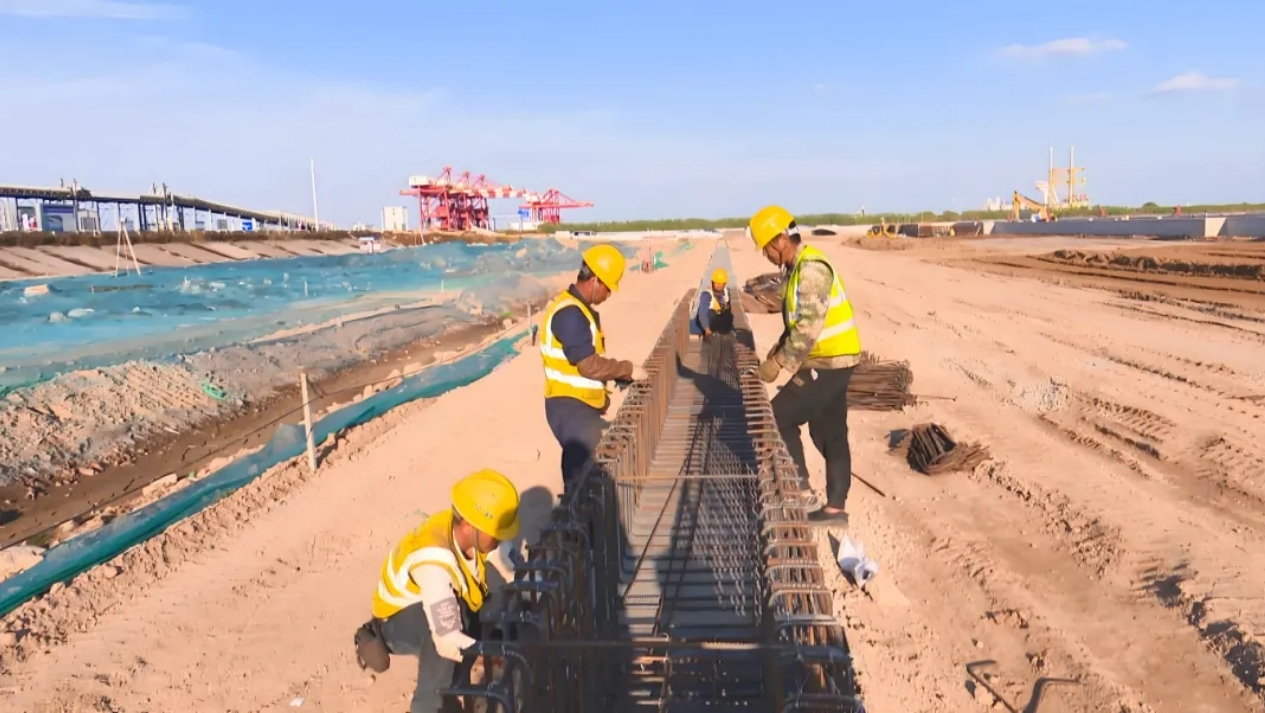 滨海港区主港区北区通用码头三期工程位于滨海港区规划主港池北侧,新建一个以装卸散装为主的公共码头,总投资约8亿元,共布置10万吨及通用泊位1个,泊位总长310m,设计通过能力为415万吨/年,可满足散货每年270万吨、件杂货每年120万吨的吞吐量要求。项目于2022年12月开工建设,计划于今年12月完工。