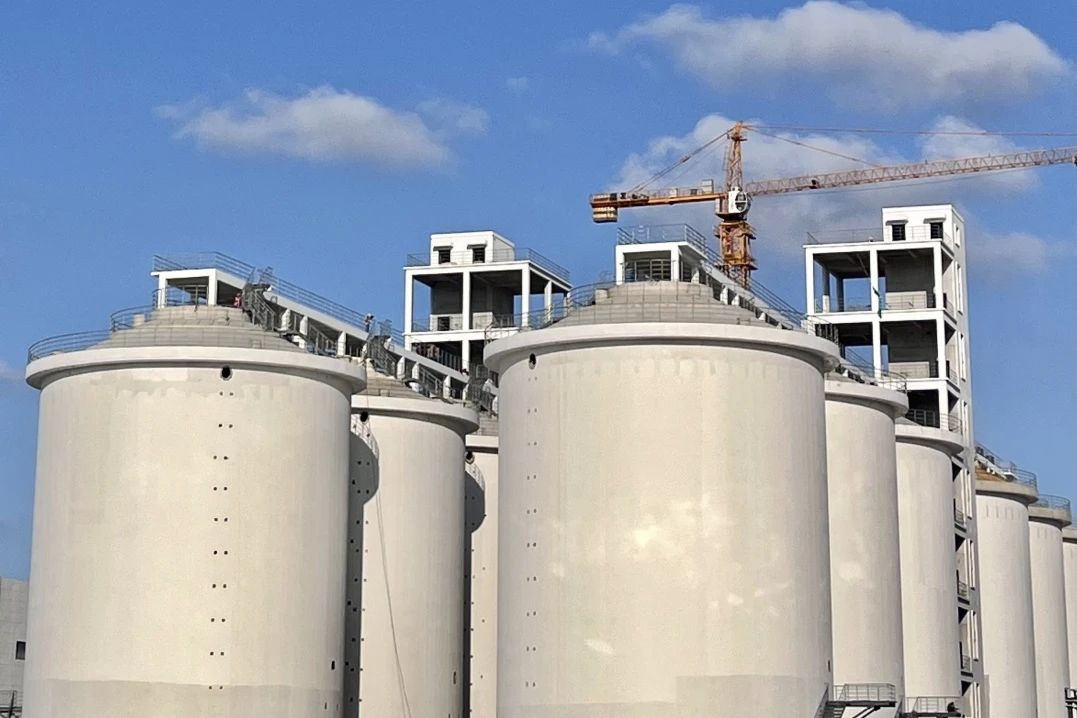 据介绍,浅圆仓单体是项目建设的关键点,也是重难点,建成后项目周转货物可达80万吨,是滨海港区规模最大的储备粮库项目。施工过程中,项目团队采用了浅圆仓滑模施工工艺,在圆周均匀布置46个油压千斤顶,推动模板系统整体缓慢滑升,全时段开展边滑升边进行仓壁的钢筋绑扎和混凝土浇筑作业,在持续作业中实现仓壁一次成型。
