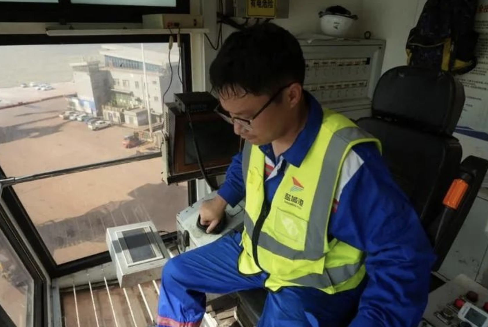 20日早晨7点40分,盐城市大丰港区通用码头上的门机班组像往常一样进行了短暂的换班仪式。在交接后,“门机手”龚海卫头戴黄色安全帽,身穿荧光绿反光衣,脚蹬橡胶底劳保鞋准备上岗。
