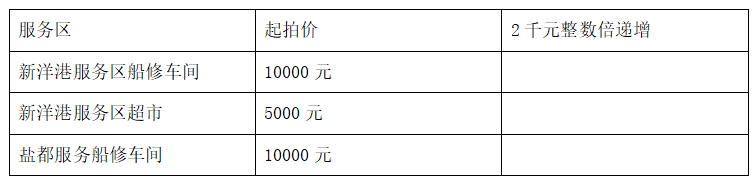 竞拍形式:公开竞拍,拍租期限为1年,每个服务区的竞拍项第一年承租费起拍价为1万元,按2千元整数倍递增(如2000、4000、6000、8000……)。如下表: