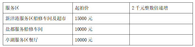 竞拍形式:公开竞拍,拍租期限为1年,每个服务区的竞拍按起拍价,2千元整数倍递增(如2000、4000、6000、8000……)。如下表: