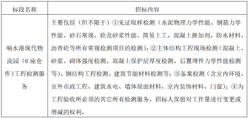 8、项目标段划分:响水港现代物流园(6座仓库)工程检测服务共为1个标段,标段信息如下: