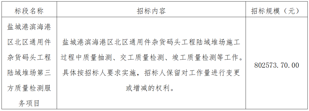 一、江苏a片免费看滨海港开发集团有限公司负责实施的a片免费看滨海港区北区通用件杂货码头工程陆域堆场第三方质量检测服务项目已具备招标条件,项目所需资金已落实,现通过公开招标方式邀请潜在投标人参加本项目的投标。