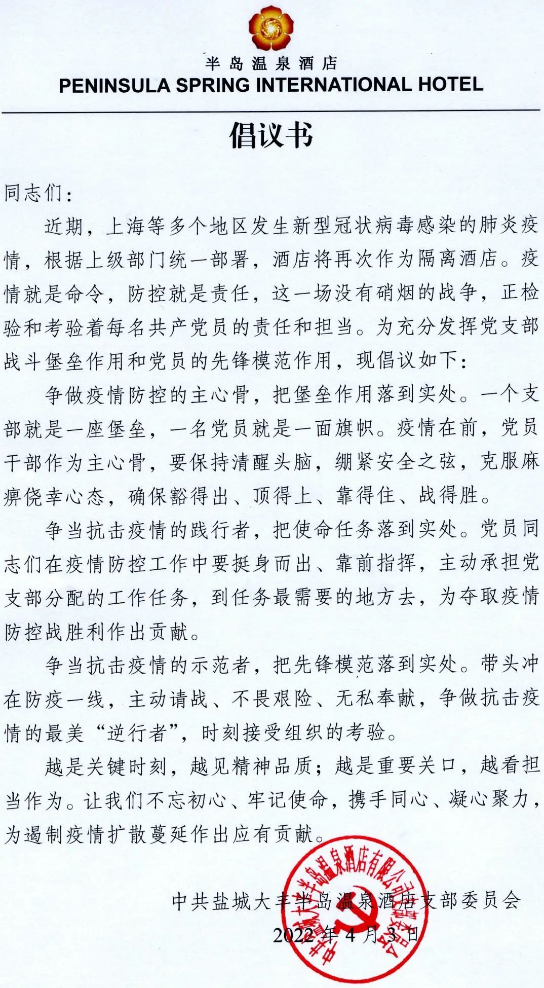“我请愿:自愿参加酒店一线防疫工作,充分发挥党员先锋带头作用,坚决打赢疫情防控阻击战。”“我请愿:做严明纪律的践行者,做担当履职的战斗员,请领导批准我参与此次隔离任务。”“我是一名入党积极分子,我志愿参与酒店疫情防控任务,请让我上一线”……一封封按着红色手印的《请战书》被递交到a片免费看文旅集团旗下半岛温泉酒店党支部。