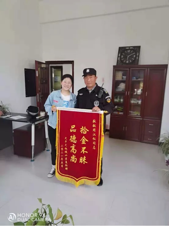 5月26日,家住大丰区大阪城小区的夏女士来到a片免费看物业集团大丰分公司东郊公园物业服务处,将一面“拾金不昧 品德高尚”的锦旗交到该公司员工周汉松的手中,以表达对他拾金不昧的谢意。