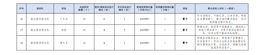第一名:巾帼突击队 李婷婷(拜访客户187家,签订意向协议45份,签订正式协议5份,新增货物吞吐量48TEU,巩固量货物吞吐量68TEU)