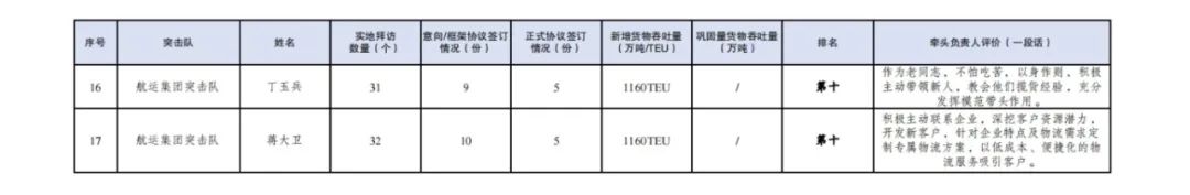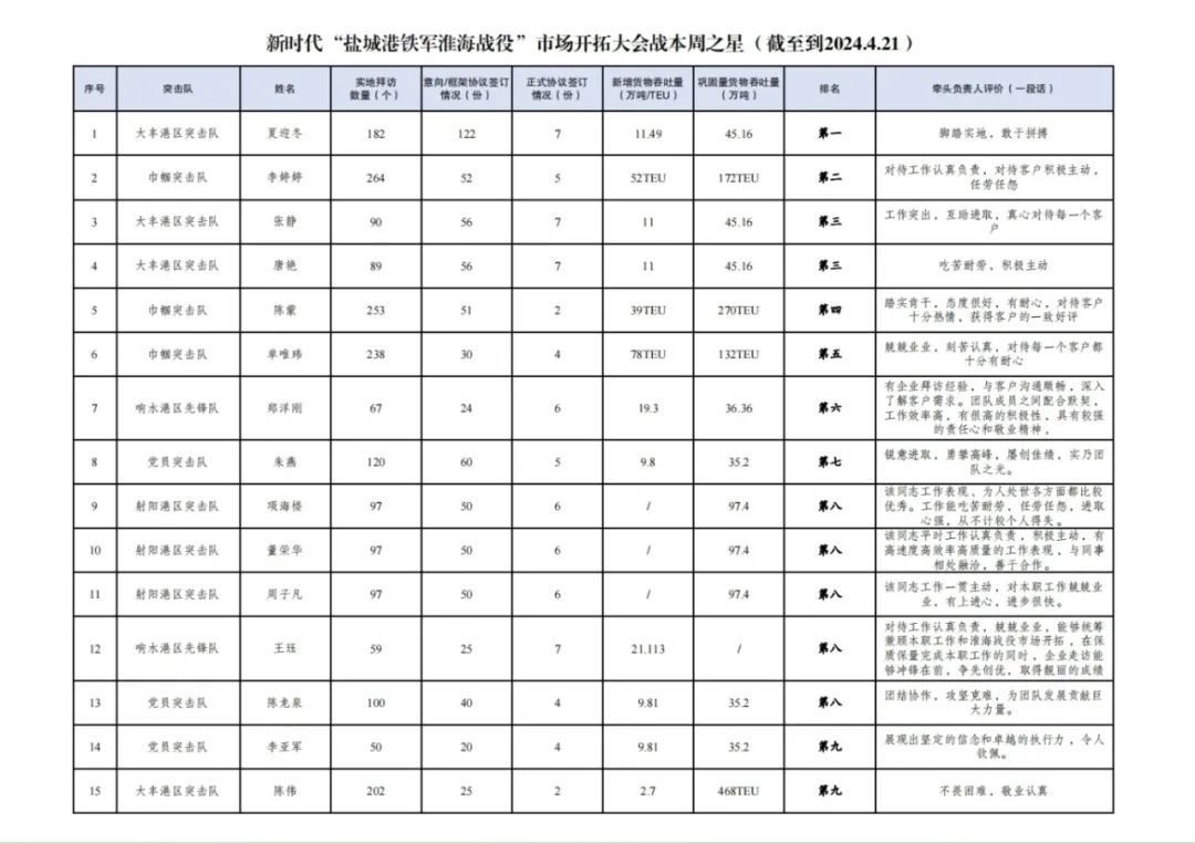 第一名:大丰港区突击队 夏迎冬(拜访客户182家,签订意向协议122份,签订正式协议7份,新增货物吞吐量11.49万吨,巩固量货物吞吐量45.16万吨)