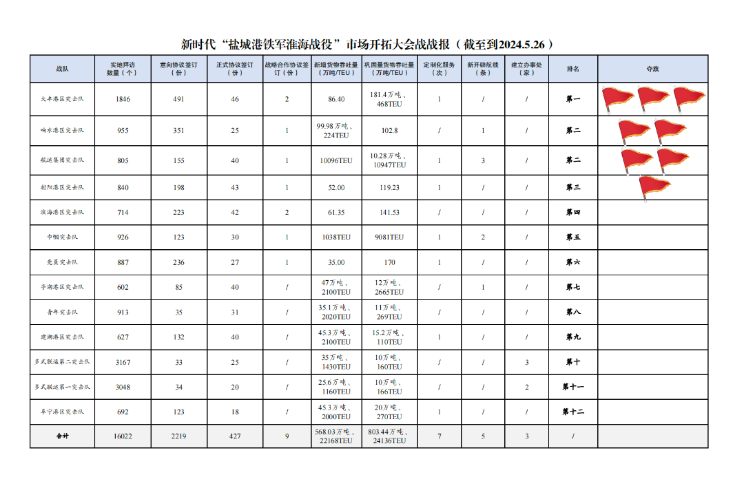 2.签订意向协议数量2219份:其中大丰港区突击队491份,响水港区突击队351份,党员突击队236份,滨海港区突击队223份,射阳港区突击队198份,航运集团突击队155份,建湖港区突击队132份,巾帼突击队123份,阜宁港区突击队123份,亭湖港区突击队85份,青年突击队35份,多式联运第一突击队34份,多式联运第二突击队33份。