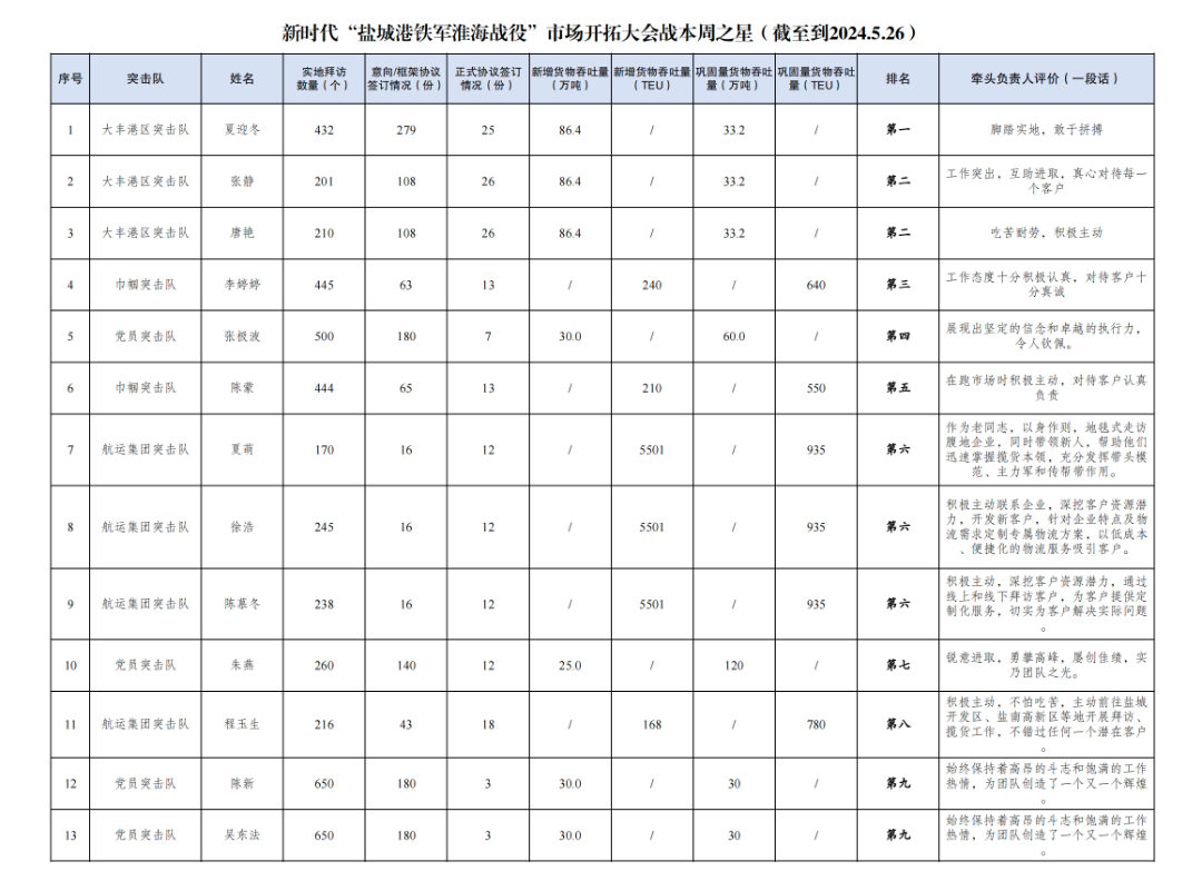 第一名:大丰港区突击队 夏迎冬(拜访客户432家,签订意向协议279份,签订正式协议25份,新增货物吞吐量86.4万吨,巩固量货物吞吐量33.2万吨);
