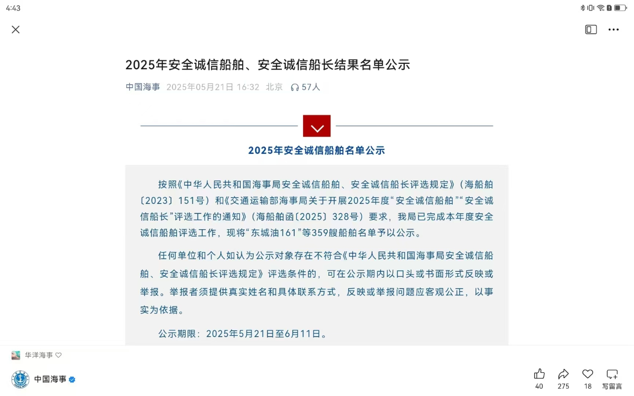 5月21日,中华人民共和国海事局公布2025年安全诚信船舶评选名单,江苏大丰港海融海运有限公司所属的盐城籍“大丰港海融”轮榜上有名。这是该船连续第二次获评“安全诚信船舶”,成为盐城籍船舶历史性“第一”。
