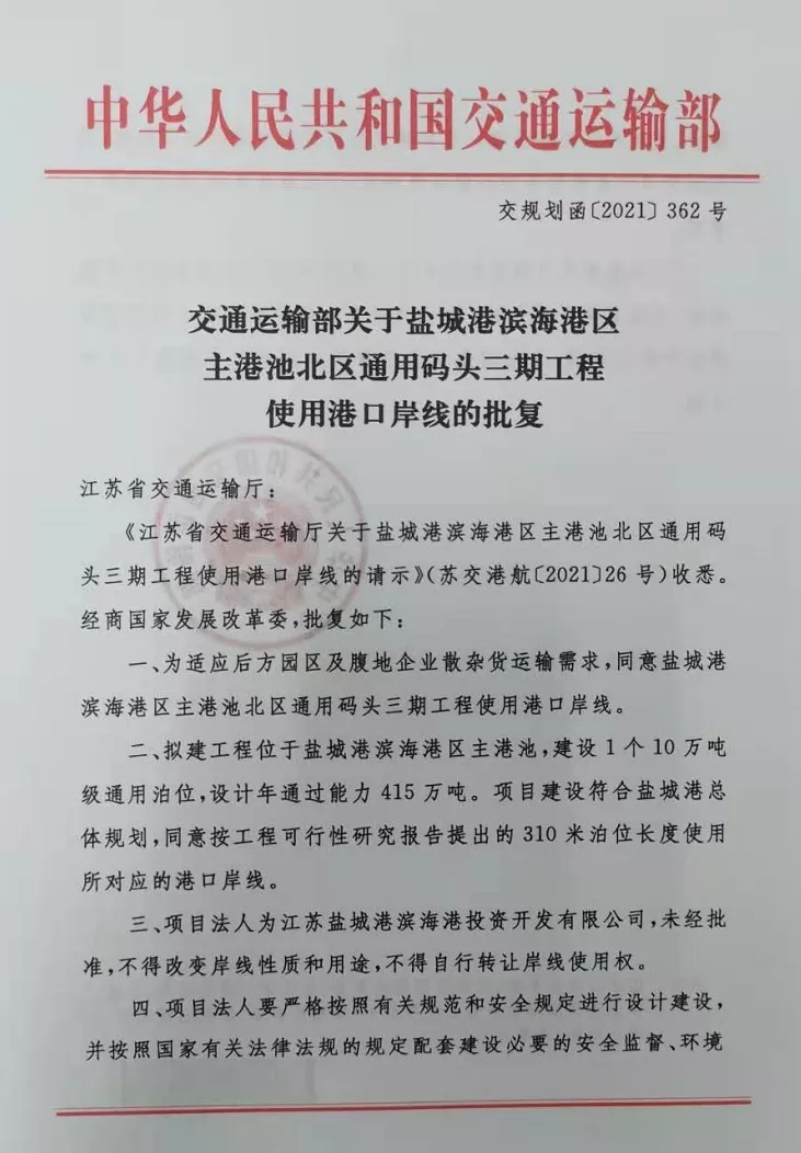 近日,交通运输部批复a片免费看滨海港区主港池北区通用码头三期工程使用港口岸线的请示(交规划函〔2021〕362号)、省发展改革委批复a片免费看滨海港区北港池防波堤一期工程可行性研究报告(苏发改基础发〔2021〕672号),标志滨海港区重大项目前期工作取得突破性进展。