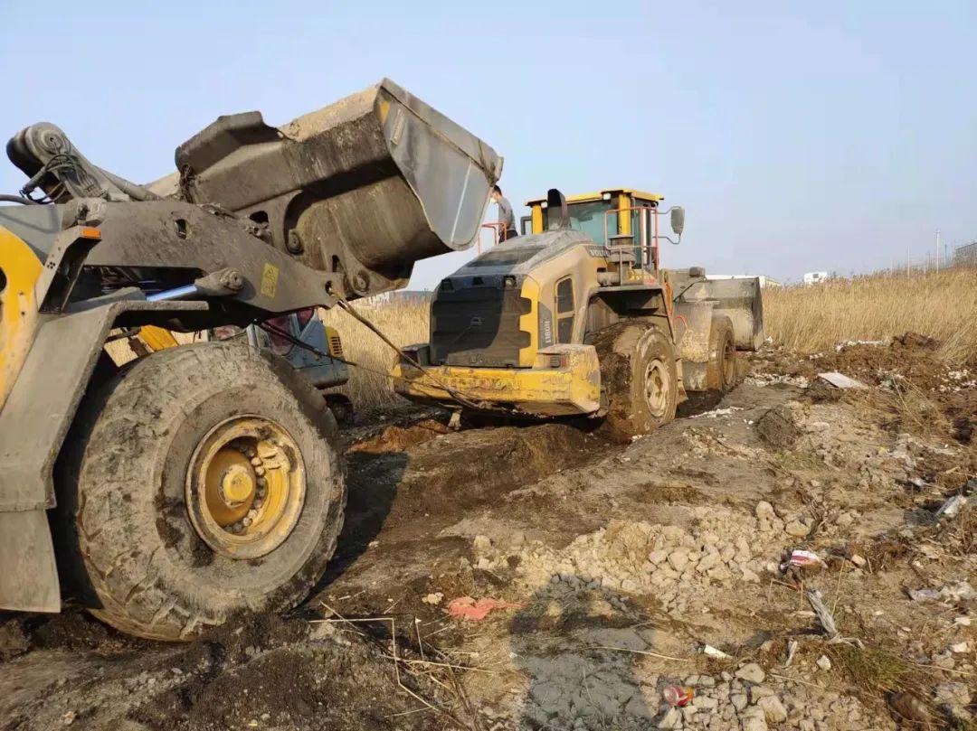 面对连续的失败,响水港区团队再次展现出了百折不挠,迎难而上的港口工匠精神,深刻剖析前两次失败原因,再次调集一台小型挖机对事件车辆轮子周边淤泥进行清理,回填石子提升其自身摩擦力,同时针对涉险装载机陷入太深可能造成底盘搁置等情况,调配一辆装载机协助抬升予以解决,并再次调集一辆装载机采用接力模式增加牵引力。经过多台机械的通力配合,受困装载机终于在拖拽中缓缓驶出泥潭,圆满完成救援工作。