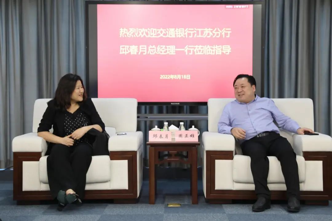 8月18日,交通银行江苏省分行投行部总经理邱春月率队拜访我集团,就相关项目合作展开交流。集团党委书记、董事长、总经理周正雄接待邱春月一行。大丰港区主要负责同志等参加。