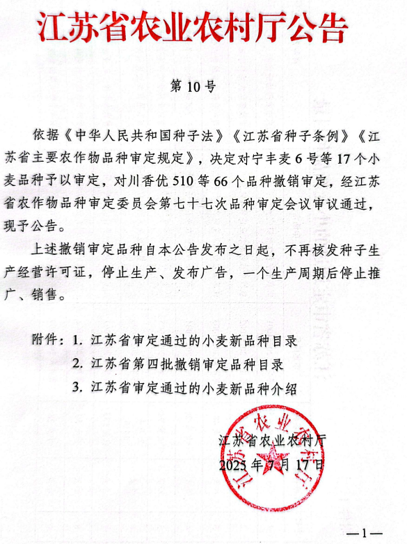 近日,江苏省农业农村厅发布第10号文件公告,宣布由江苏金色农业股份有限公司与里下河地区农业科学研究所联合选育的小麦新品种“扬麦51”正式通过江苏省农作物品种审定委员会的审定,审定编号为:苏审麦20253002。