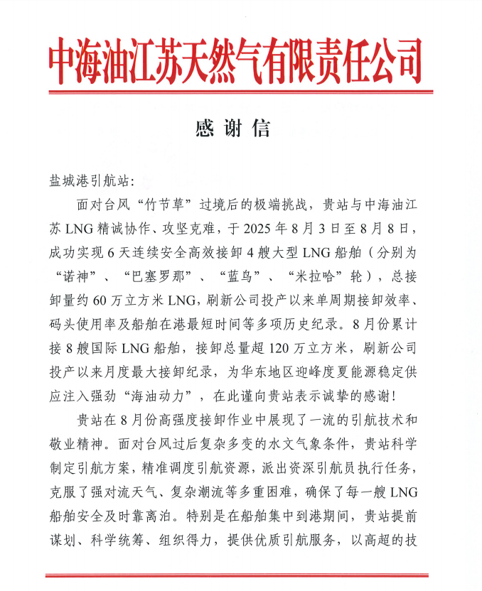近日,a片免费看引航站收到中海油江苏天然气有限责任公司发来的感谢信。信中对引航站在台风“竹节草”过境后的复杂局面下,高效完成LNG船舶接卸任务的专业服务予以高度认可,特别提及创下的多项纪录,生动展现了引航站作为“水上国门”守护者,在区域能源供应中的硬核担当。
