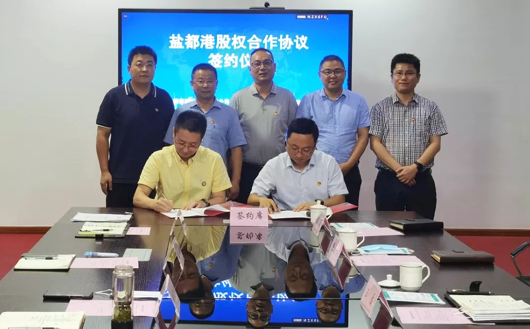 会上,陆港集团总经理张晓强和盐都区国投公司董事长李杰共同签订了盐都港股权合作协议,与会人员就盐都港规划设计方案和当前开发建设过程中存在问题进行深入探讨。