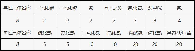 表1 常见毒性气体校正系数β值取值表