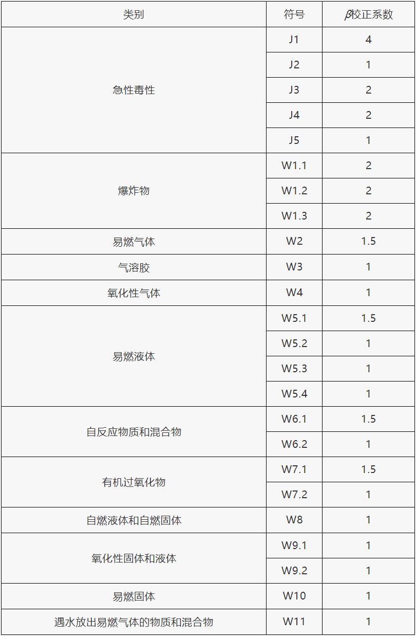 根据单元内危险货物的类别不同,设定校正系数(β)值,在表1范围内的危险货物,其β值按表1确定,未在表1范围内的危险货物,其β值按表2确定。