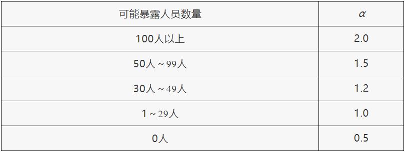 根据重大危险源所在港口企业作业区边界向外扩展500米范围内常住人口数量,设定暴露人员校正系数(α)值,见表3。