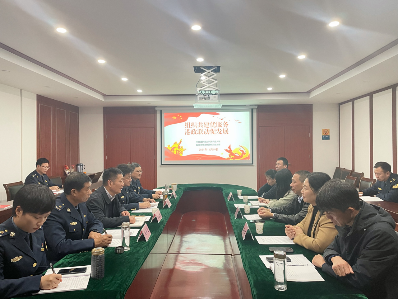 11月19日下午,陆港集团机关党支部和市交通运输综合行政执法支队第八党支部联合开展了以“组织共建优服务 港政联动促发展”为主题的党建共建活动。