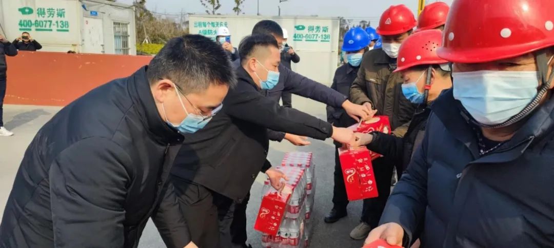 在慰问现场,项目管理公司相关负责同志首先对工友们的坚守与付出表示了感谢,在年初二就舍弃与家人团聚,来到项目施工现场参加作业,这种舍小家、为大家精神,不仅体现了强烈的责任担当和奉献精神,更展现了良好的精神风貌和大局意识。随后把慰问物资一一送到工友的手中,并叮嘱广大工友们,要科学安排作息时间,保持良好精神状态,同时做好工地防疫、工地卫生、工地消防等安全工作,久久为功、众志成城,相信在广大工友的辛勤劳作和夜以继日的奋战下,疫情隔离点项目一定能顺利按时完成。