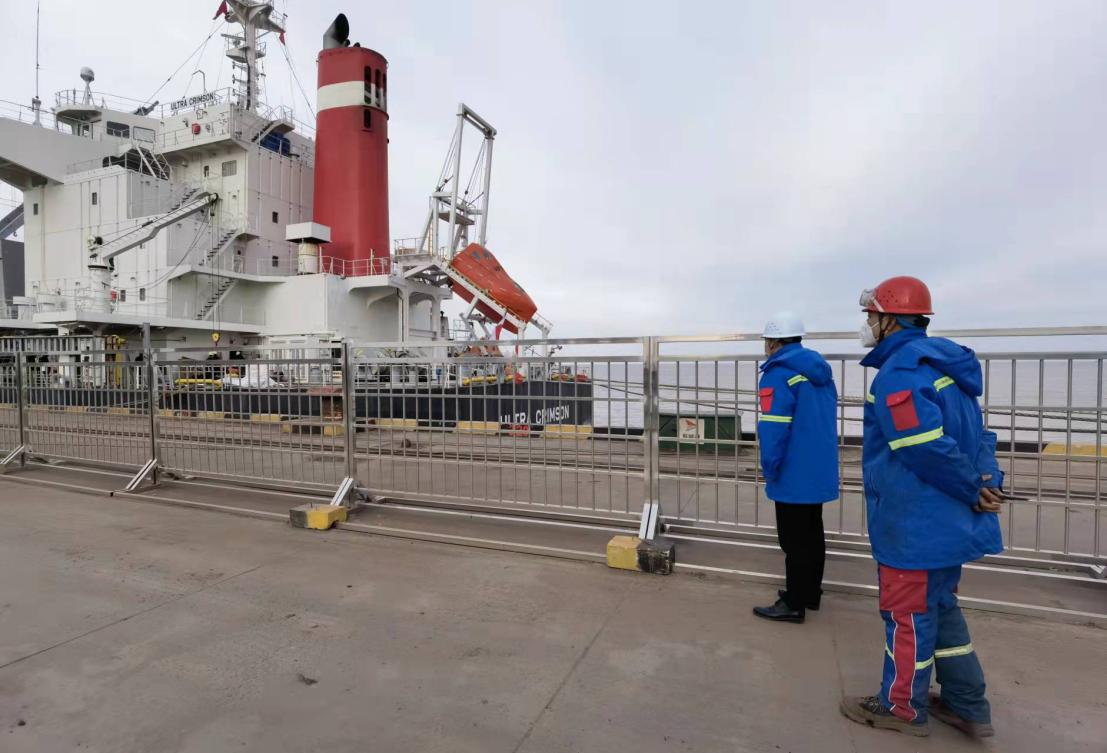 农历正月初二,外贸板材船“奥姆斯基115”停泊在粮食码头分公司6#泊位,码头作业人员严格执行“内外分开”要求开始装卸作业。