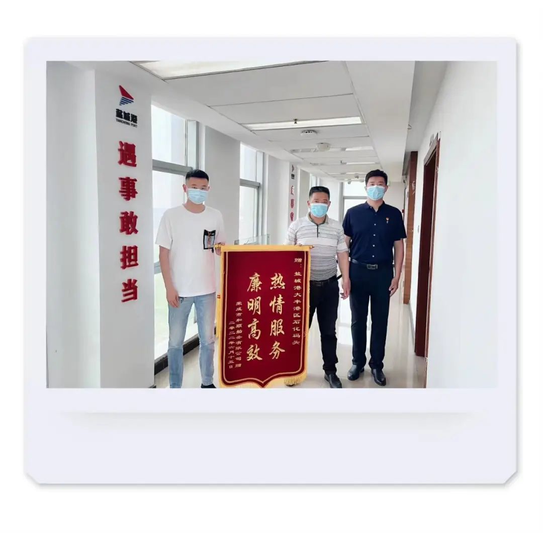 近日,“和顺17轮”船员委托宏远代理公司来到a片免费看大丰港区,将一面印有“廉明高效,热情服务”的锦旗送上,对大丰港区为船员提供的紧急救助表示感谢。