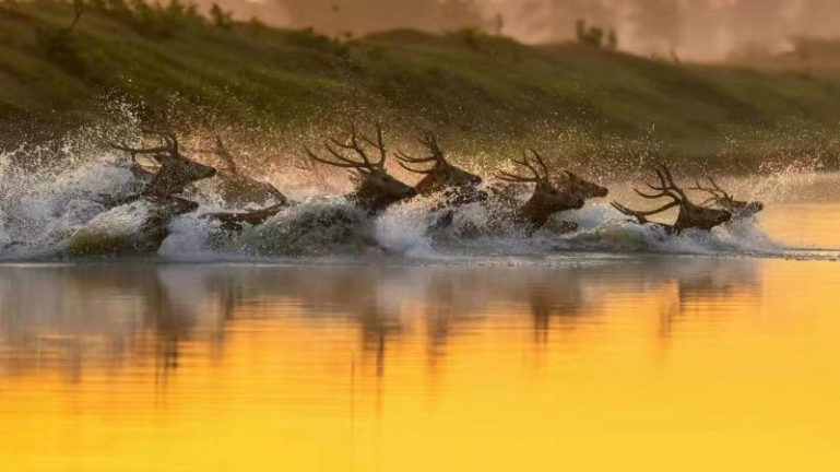 看麋鹿在浅水中的肆意奔跑