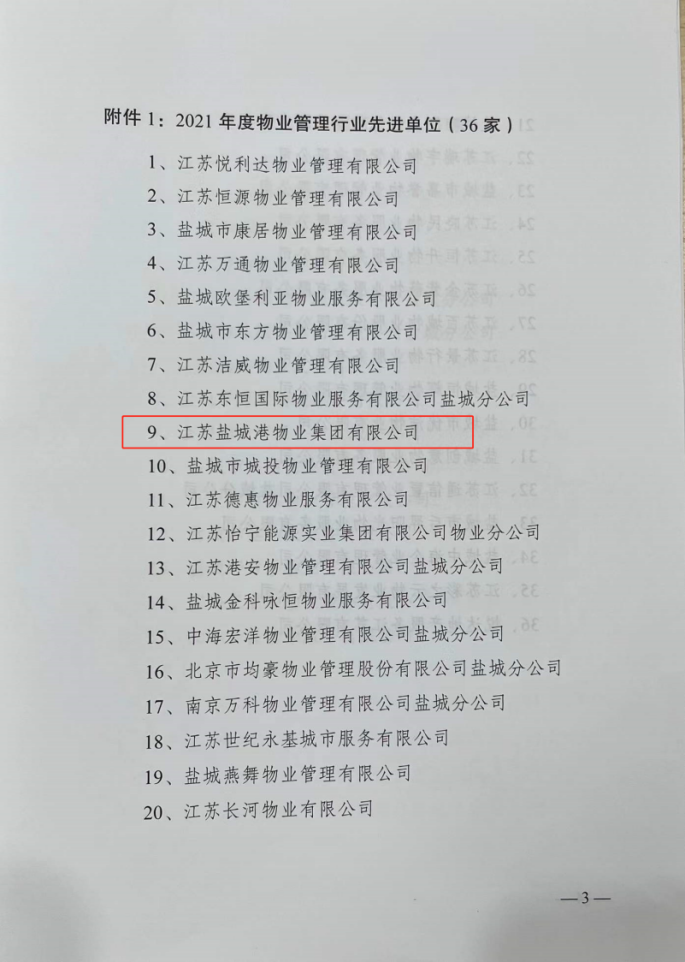 近日,盐城市物业管理行业协会对全市物业管理行业先进单位和先进个人进行了表彰,江苏a片免费看物业集团有限公司获评“2021年度物业管理行业先进单位”荣誉称号。