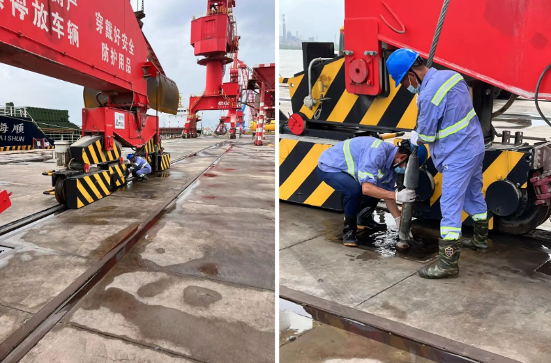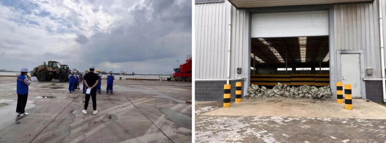 演练模拟安全环保部人员接到上级气象灾害预警通知,我区域将出现强降水、8级以上雷暴大风极端天气。接到通知后,相关部门立即停止室外作业,紧急启动《防台防汛应急预案》。门机防风演练现场,应急演练人员打开隐藏式坑位盖板,门机移机定位、下锚定插板、加固防风拉索,快速完成单台门机防风加固任务。物流园防汛演练现场,抢险人员对室外堆场进行针对性排水,并用沙袋将仓库、配电房等重点部位进行封堵,迅速完成防洪墙堆建。