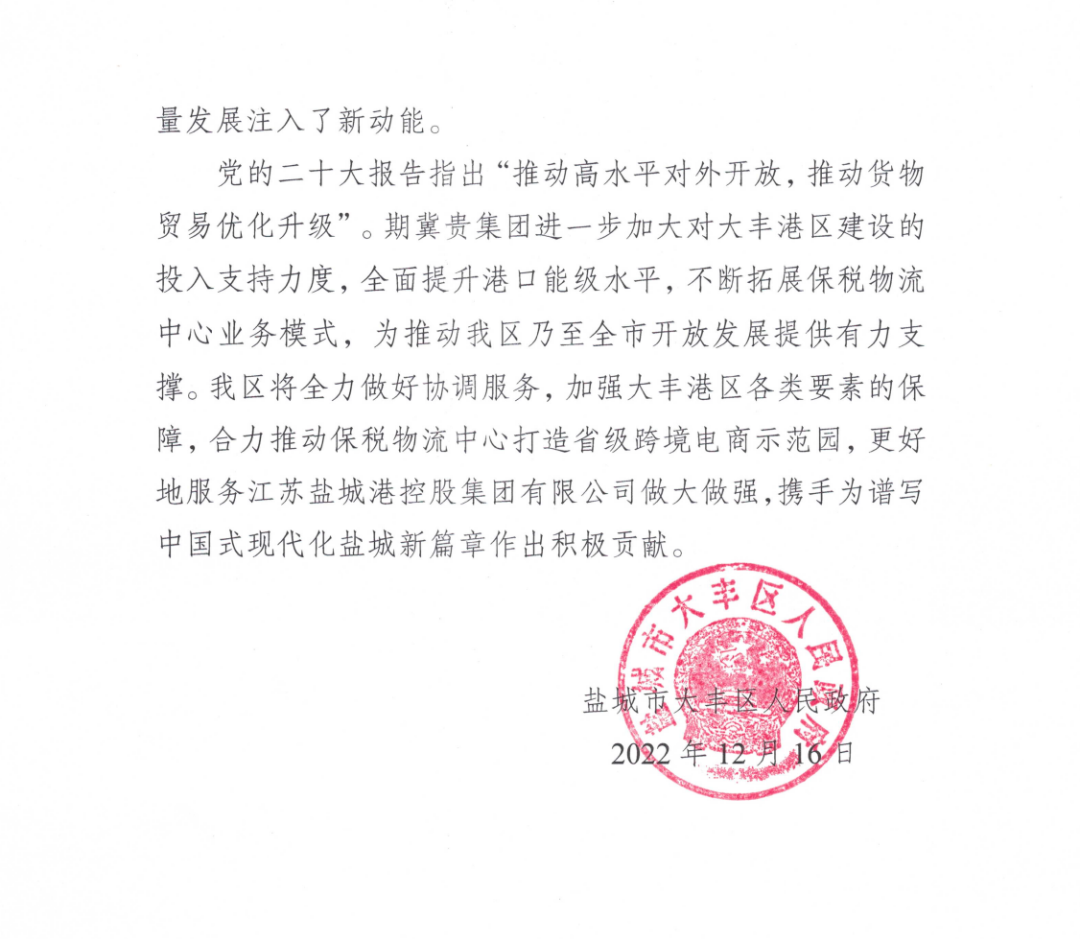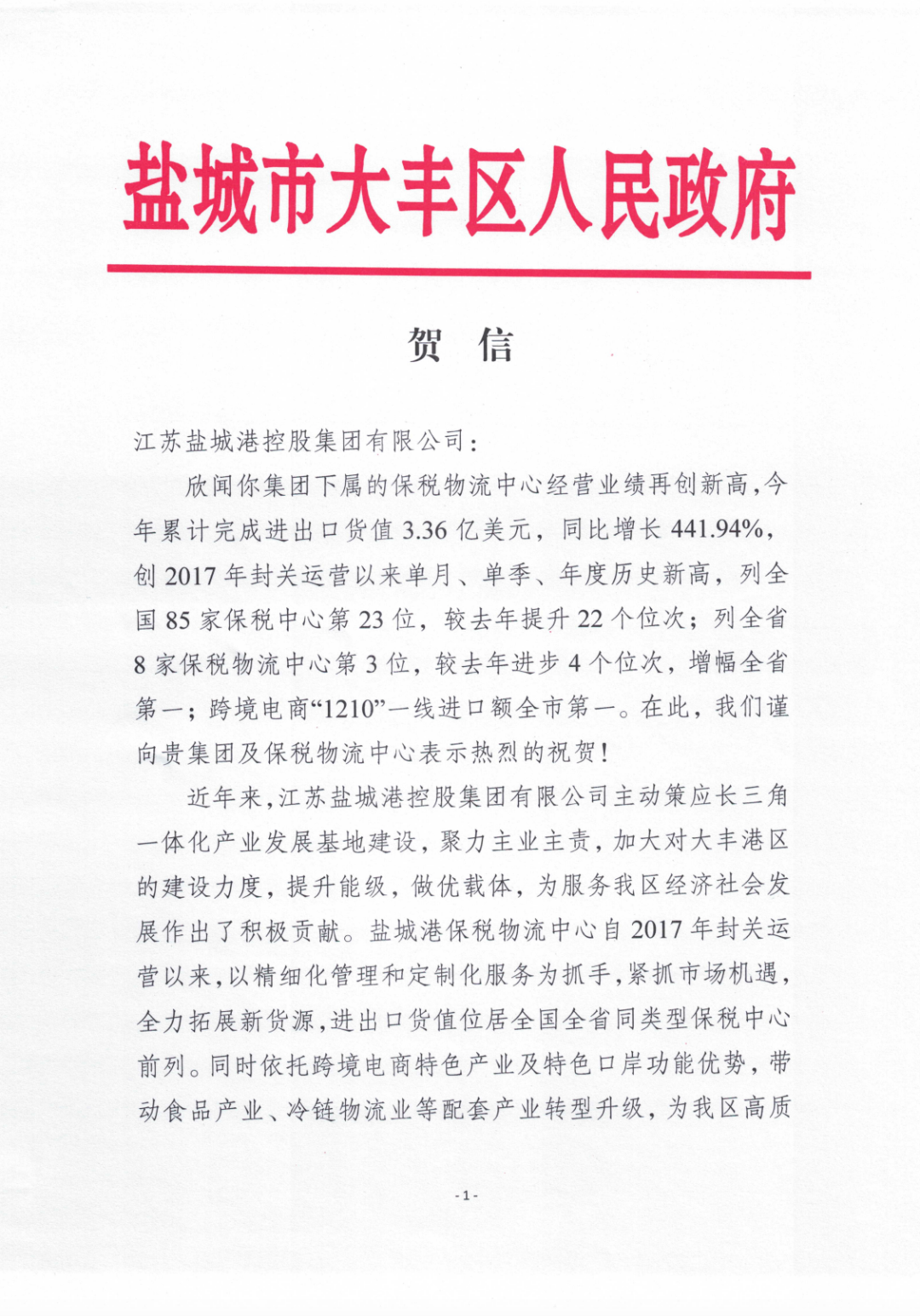 12月16日,大丰区人民政府向我集团发来贺信,对我集团下属保税物流中心经营业绩再创新高表示祝贺。