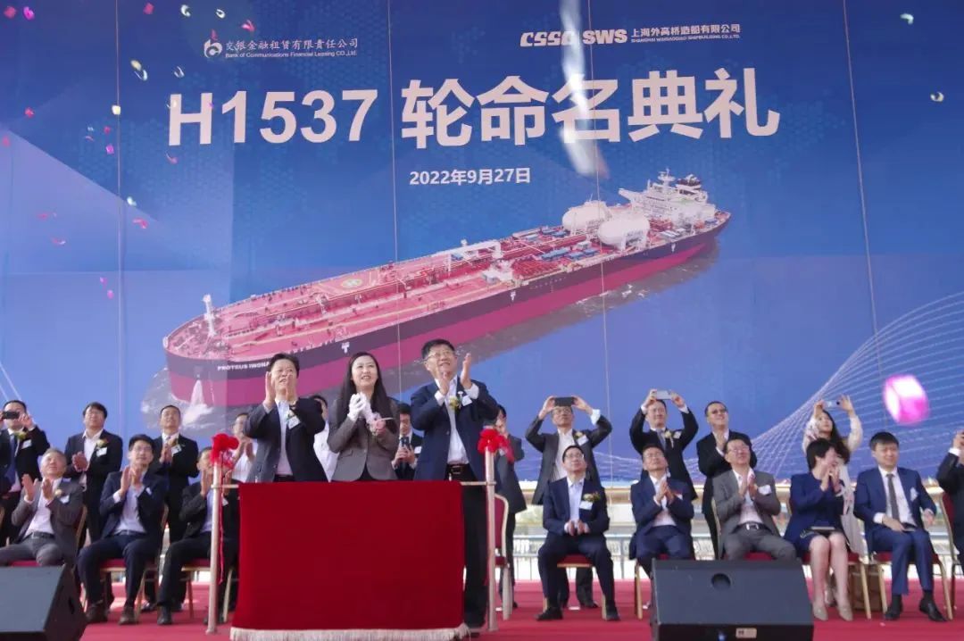 9月27日,交银金租与外高桥造船合作新造的H1537号LR2型油轮命名交付。本项目订造的LR2型成品油轮是目前全球最大的成品油运输船只,是外高桥在大型油轮建造领域的又一重要成果,代表了当前世界上成品油轮建造的最高水平,得到了国际一流货主壳牌石油和国际头部船级社的一致认可。