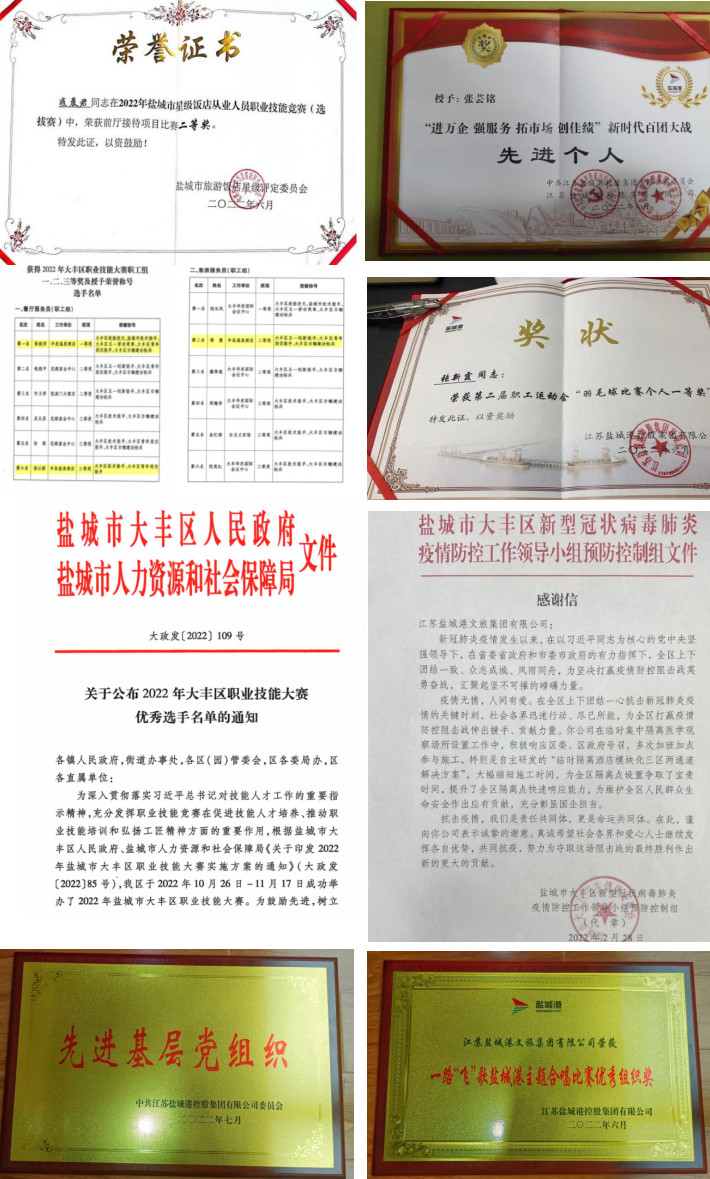 2022年,文旅集团党总支和港泊半岛酒店支部被评为“先进基层党组织”。文旅集团洪兵、韩世军在a片免费看 “七一”表彰中获评优秀共产党员称号,蒋雷获评优秀共青团员称号。港泊半岛酒店职工张晓芳、汤以新、蒋慧等同志分别获得大丰区技能状元、盐城市技术能手、大丰区五一劳动奖章、大丰区青年岗位能手、大丰区巾帼建功标兵称号。