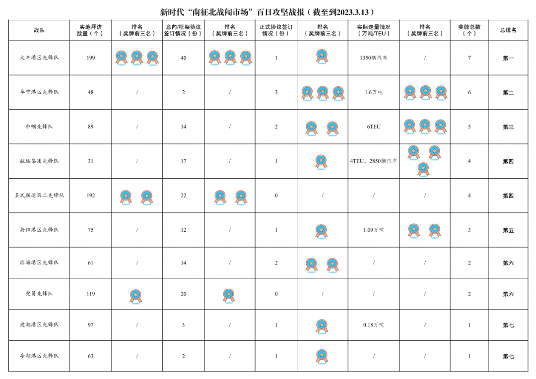1.累计拜访客户数量1179家:其中大丰港区先锋队199家,多式联运第二先锋队192家,党员先锋队119家,响水港区先锋队99家,滨海港区先锋队97家,巾帼先锋队89家,射阳港区先锋队75家,亭湖港区先锋队63家,滨海港区先锋队61家,多式联运第一先锋队55家,青年先锋队51家,阜宁港区先锋队48家,航运集团先锋队31家。