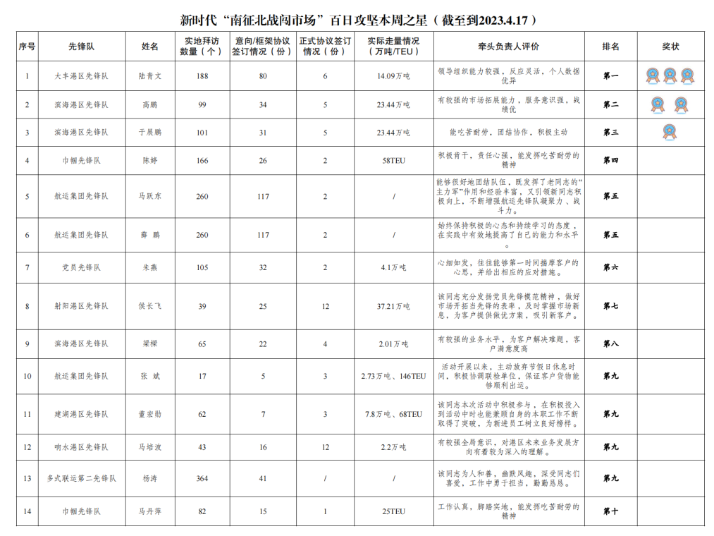 第一名:大丰港区先锋队 陆青文(拜访客户188家,签订意向协议80份,签订正式协议6份,实际走量14.09万吨)