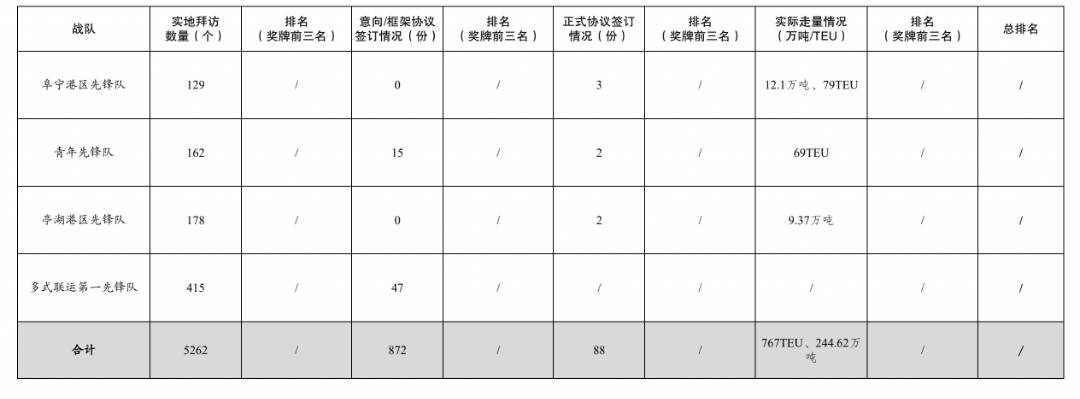 活动开展以来,累计拜访客户数量5262家,签订意向/框架协议数量872份,签订正式协议88份,实际走量767TEU、244.62万吨。