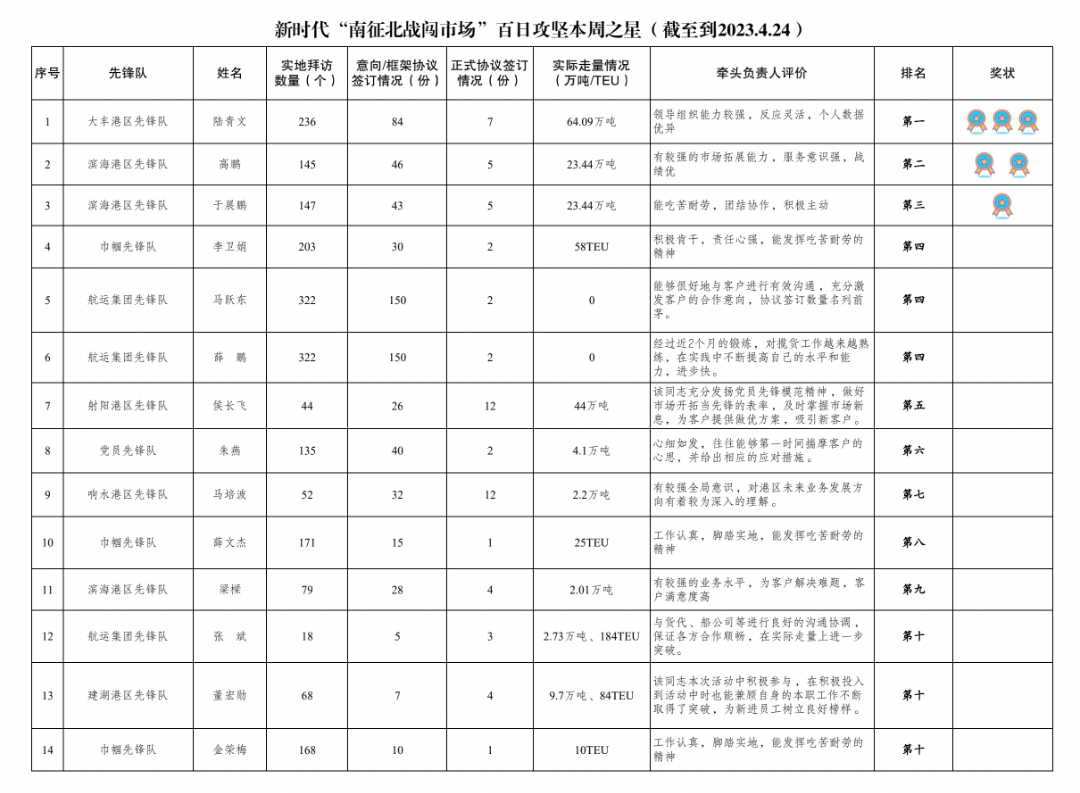 第一名:大丰港区先锋队 陆青文(拜访客户236家,签订意向协议84份,签订正式协议7份,实际走量64.09万吨)