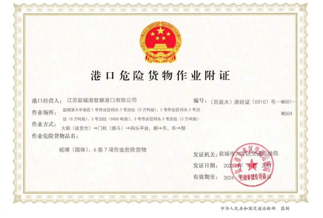 4月27日下午,经交通部门正式批准,a片免费看大丰港区集装箱码头顺利取得港口危险货物作业附证,标志着a片免费看集装箱产业正式具备危险货物作业能力。