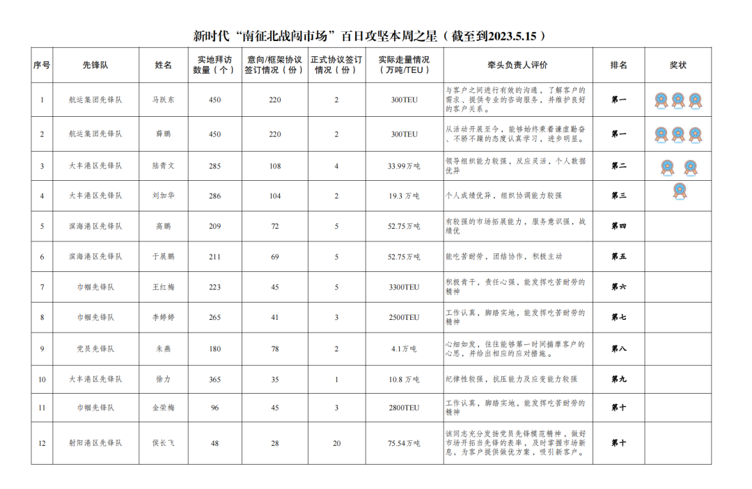 第一名:航运集团先锋队 马跃东、薛鹏(拜访客户450家,签订意向协议220份,签订正式协议2份,实际走量300TEU)