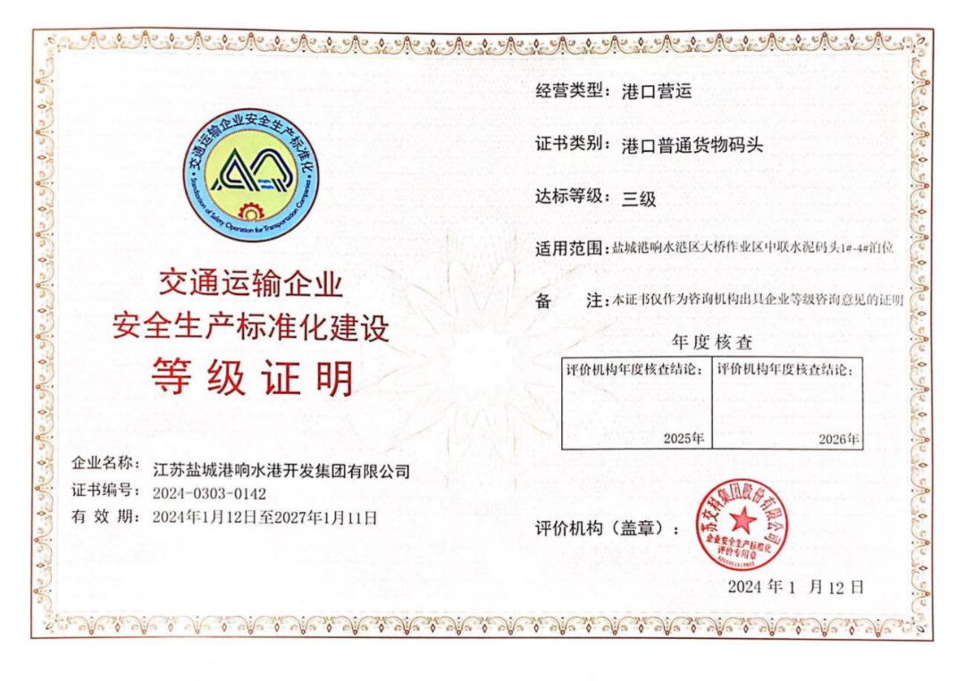 近日,a片免费看响水港区灌江港务分公司顺利通过交通运输企业安全生产标准化认证考核,并取得“交通运输企业安全生产标准化建设三级证书”,标志着响水港区灌江港务分公司安全生产管理工作迈上新台阶。