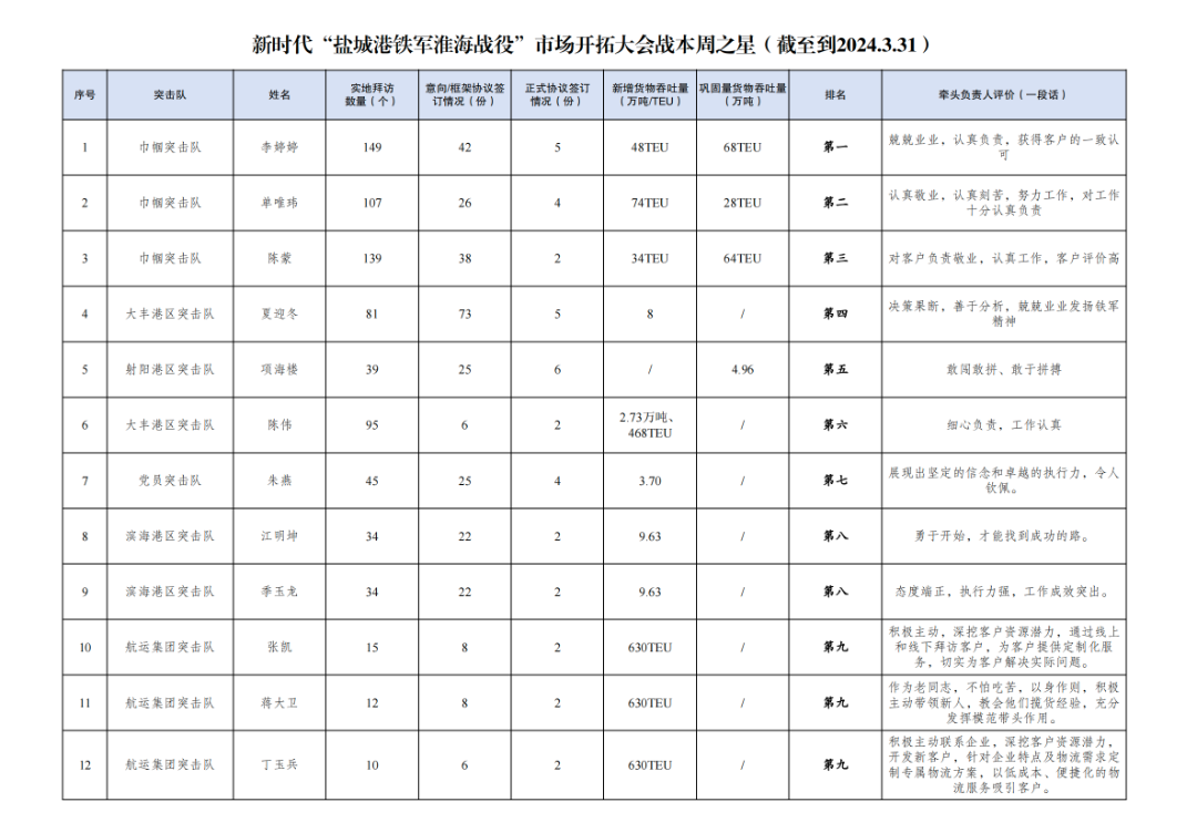 第一名:航运集团、响水港区突击队、阜宁港区突击队、巾帼突击队、多式联运第一突击队突击队1次