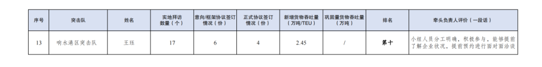 第一名:巾帼突击队 李婷婷(拜访客户149家,签订意向协议42份,签订正式协议5份,新增货物吞吐量48TEU,巩固量货物吞吐量68TEU)