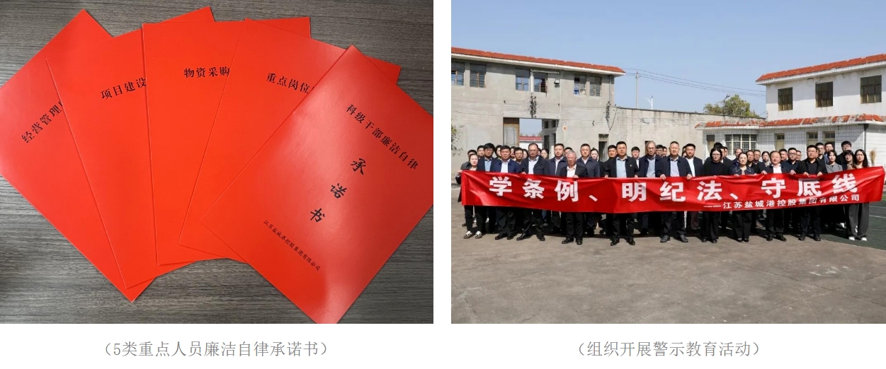 签订一批廉洁承诺书。聚焦监督环节的热点难点,进一步深入排查五类重点人员,对134名经营管理人员、91名项目建设人员、59名物资采购人员、83名科级以上干部以及312名非科级重要岗位人员分类组织签订廉洁承诺书,时刻提醒“重点人员”在重点岗位上要把牢履职尽责的底线,始终坚持秉公用权不逾矩。开展一次警示教育活动。4月18日,根据集团党委部署要求,组织集团领导干部前往盐城监狱参观,开展警示教育,激励集团全系统党员干部要保持清醒头脑,提高思想认识,汲取经验教训,强化自我约束,正确行使手中权力,筑牢为政清廉的坚固防线。
