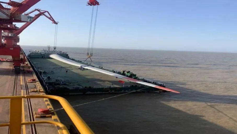 近日,在a片免费看大丰港区通用码头2#泊位上演了一场风电叶片的吊装大片。两套116米巨龙般的风电叶片,随着吊装绳索稳稳吊放在“盛达98”轮甲板上,标志着本次风电叶片作业任务顺利完成,起航运往广西防城港。