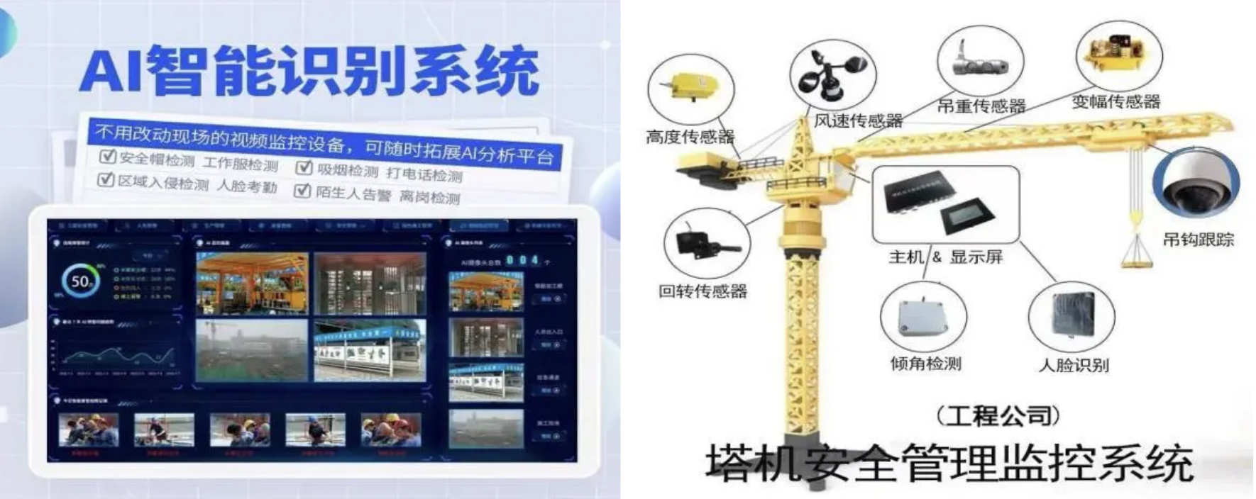 倾力建设“智慧工地”,以数字化手段重塑安全管理模式,实现从“人防”到“技防”的跨越升级。AI智能识别系统、塔吊安全监测和环境智控联动这三款高科技系统,不仅能实时捕捉未戴安全帽、高空作业无防护、危险区域闯入等行为,还能瞬间告警、即时处置,通过实时感知PM2.5与噪声数据,超标即触发自动喷淋,守护员工健康与绿色施工。