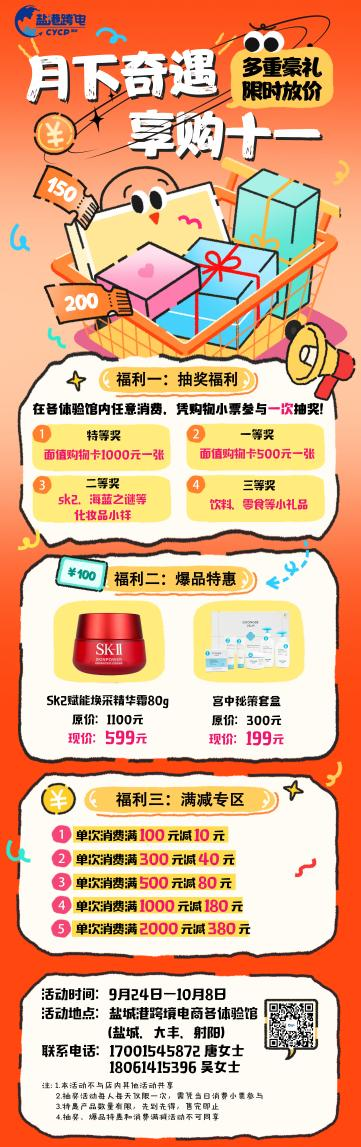 莎士比亚跨境电商国际商贸小镇将于2025年9月24日至10月8日推出以“月下奇遇,享购十一”为主题的系列促销活动。活动期间,消费者可在盐城、大丰、射阳三地的跨境电商体验馆享受多重福利:消费即可参与100%中奖抽奖,奖品涵盖千元购物卡、热门美妆小样等;单笔消费满100元起即可参与多档满减优惠,最高立减380元;更有爆款单品直降促销,如SK2赋能焕采精华霜由原价1100元优惠至599元,诚意回馈顾客。本次活动通过线上线下多渠道联动宣传,并提前备足货源、优化服务流程,力求为消费者带来优质、便捷的购物体验,进一步激发节日消费市场活力。