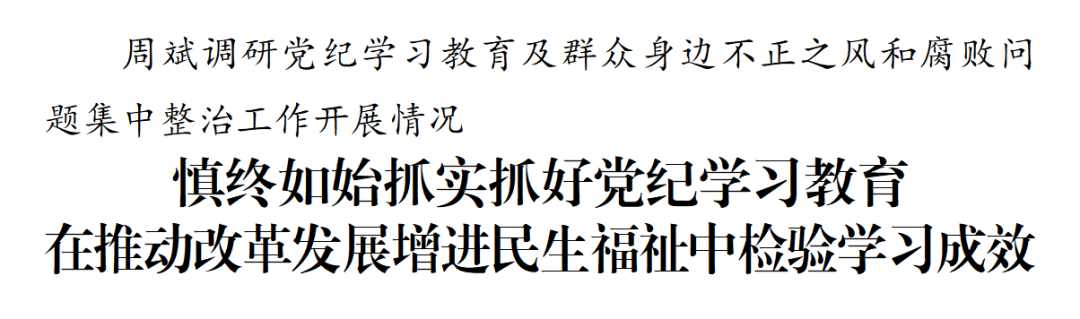 周斌在调研中指出,党纪学习教育要强化原文研学,深学细悟习近平总书记关于全面加强党的纪律建设的重要论述,坚持融入日常、抓在经常,持续在深化内化转化上下功夫,引导党员干部更好把遵规守纪刻印在心。要强化警示教育,用好红色资源、鲜活案例和生动现场,加强正面引导和反面警示,让党员干部受警醒、明底线、知敬畏,真正做到知行知止。要强化学用结合,坚持两手抓、两促进,将党纪学习教育与整治形式主义为基层减负、整治群众身边不正之风和腐败问题、推进经济社会高质量发展相结合,在严格约束下积极担当作为,切实把学习成效转化为推动改革发展、增进民生福祉的实际举措,真正让党员受教育、发展见成效、群众得实惠。