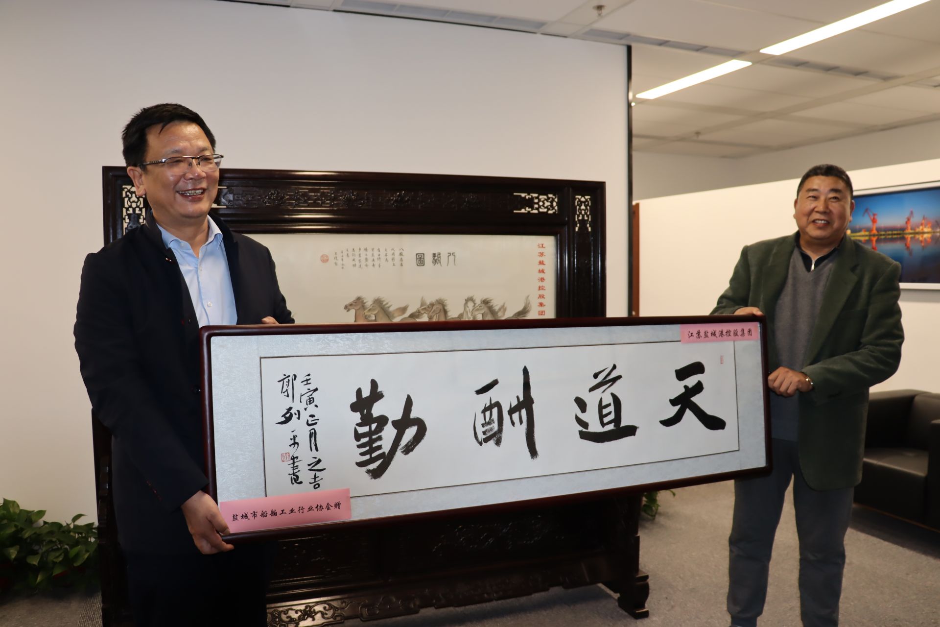 3月10日下午,盐城市交通运输局、市交通运输综合行政执法支队、市综合交通学会和市船舶工业行业协会来到a片免费看控股集团进行授匾调研洽谈,在集疏运体系建设与发展、一线员工安全技能培训及船舶设计与制造等事宜双方达成共识。集团党委书记、董事长、总经理周正雄和集团党委委员、董事、副总经理夏立新及市综合交通学会副理事长潘进山、市地方海事局原局长周炳学共同为授匾揭幕。