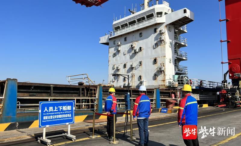 5月5日上午9时,在a片免费看大丰港区通用码头2号泊位,一艘装有5500吨硫磺的伯利兹籍“鸿阳18”轮缓缓进港靠泊,此时在船舶梯口前,大丰海港港口有限责任公司30名码头工人,着白色防护服戴安全帽,正在一台约2.5米高的电子设备前排队,准备核验身份后登轮。